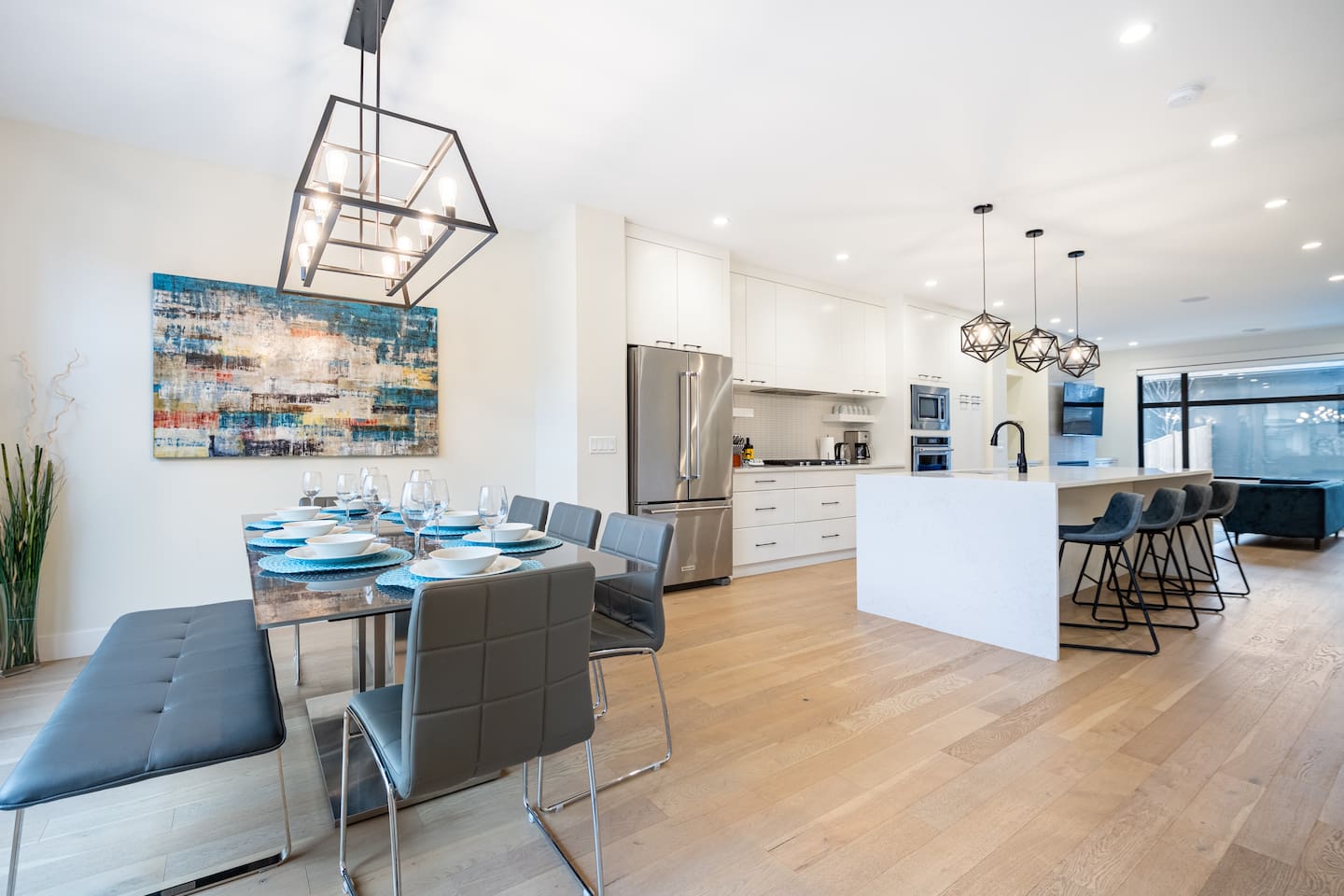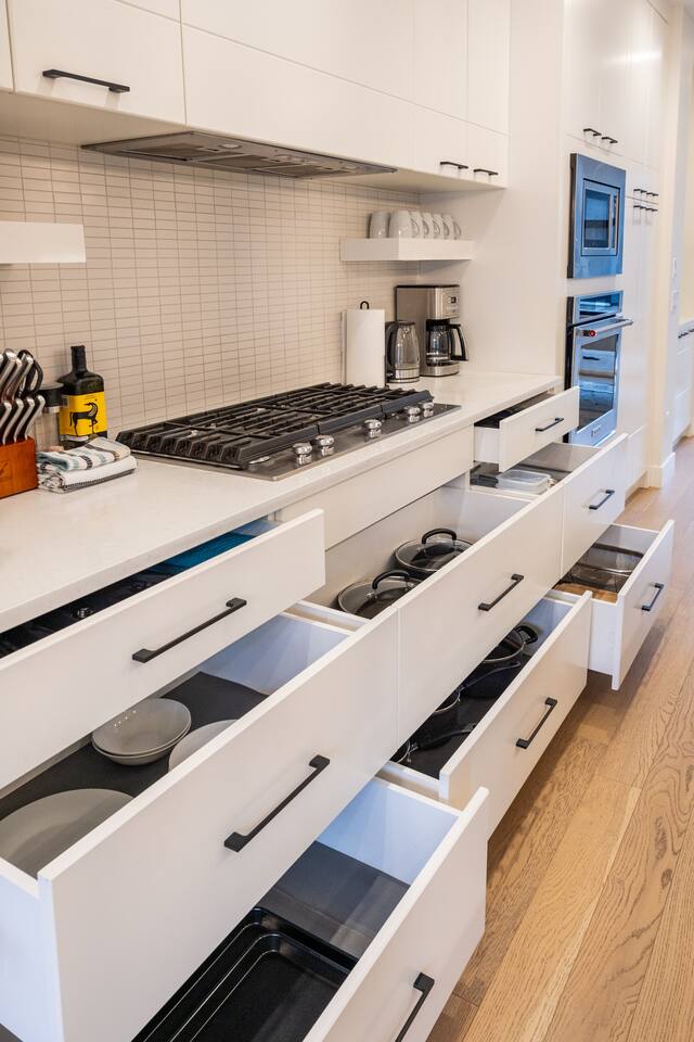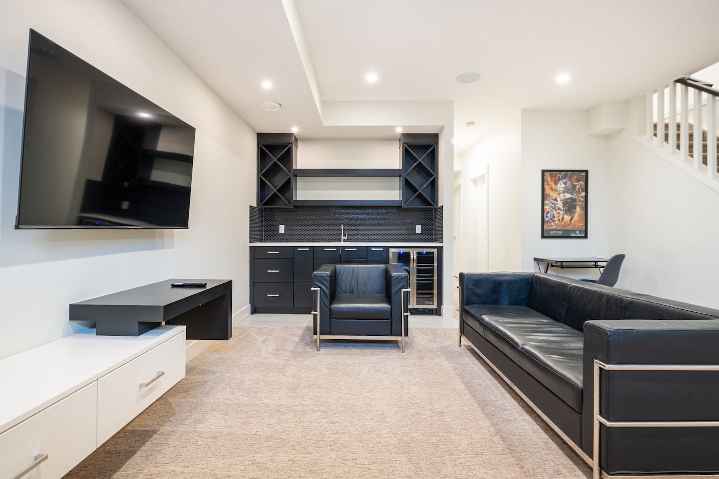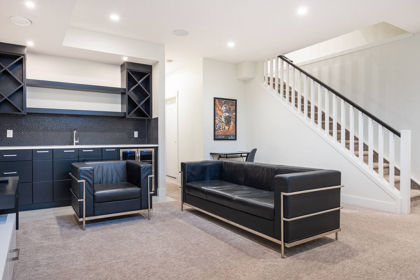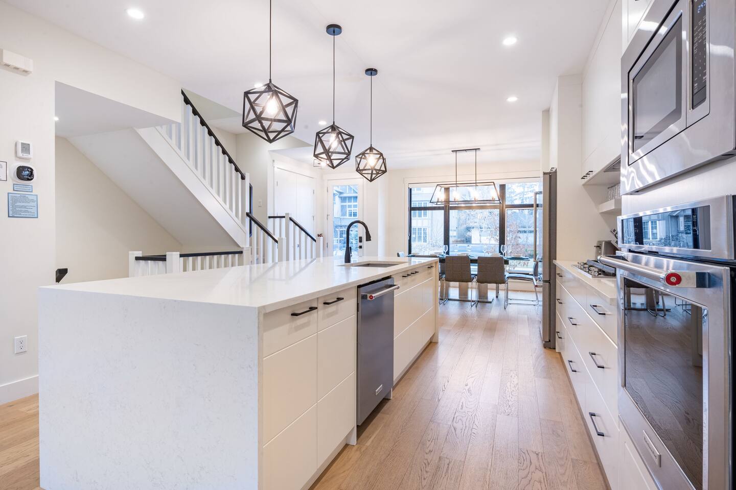 Features Incuding: - King size beds in the master bedroom and queen beds in the other 3 bedrooms. There is an additional queen bed that can be set up in the basement living room. - 2 Car garage. - Backyard. - Designated work space. - Fast 1 Gig Wifi speed. - Dining table that seats 8 people! - Two large Smart TV's on 2 different levels. - Large soaker tub in the master bedroom ensuite bathroom. - Finished basement with a big screen TV, wetbar, 4 piece bathroom and bedroom with a queen bed. - Large closets in all bedrooms. - 3 Full bathrooms and 1 half bath. - Professional appliances including a 5 burner gas stove. - Coffee station with coffee, creamer, sugar & tea. - All bathrooms are fully stocked with shampoo, conditioner, shower gel, hand soap and hair dryers. - Laundry room with washer & dryer, iron and ironing board